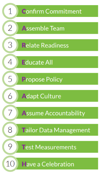 The foundation of the program is AWHONN’s comprehensive RMC Implementation Toolkit, built around the 10-Step C.A.R.E. P.A.A.T.T.H. and grounded in the Respectful Maternity Care Evidence-Based Guideline and Framework. This structured pathway guides organizations in integrating respectful care through the following steps – see image.